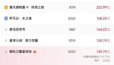 《哪吒2》衝上全球影史票房榜第5 海外熱潮持續升溫香港新聞網3月16日電 根據貓眼專業版數據,改編自中國神話故事的動畫電影《哪吒之魔童鬧海》(簡稱《哪吒2》)累計票房突破150.19億元,超越《星球大戰:原力覺醒》,躋身全球電影票房榜前五。