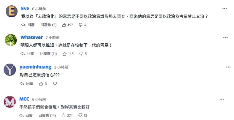 台灣網友留言截圖 中國國民黨立委柯志恩曾指出,鄭英耀熱衷政治、根正苗“綠”。台灣《聯合報》也直言,鄭英耀是拚政治“第一名”。日前,鄭英耀於全台大專校院校長會議宣布,禁止台灣的大學與廣州暨南大學等3所大陸的大學交流,後續又將北京理工大學等7所與大陸國防軍事工業密切關連的大學,也一同列入禁止交流名單。如今,鄭英耀話裡話外又對兩岸中小學交流設限,讓不少人加深對於兩岸關係的憂慮。 全台教師工會總聯合會理事長侯俊良表示,教育應該回歸教育,純粹的學術交流,台當局有責任釐清界線,兩岸彼此互相尊重機制,避免背後政治等不必要因素困擾,貿然全部禁止兩岸交流需要再討論。 日前,台灣大學教授苑舉正指出,歷史和現實早已證明,兩岸民間的聯繫是任何政治勢力都無法真正切斷的。賴清德阻礙兩岸交流的行為,本質上是“玩火自焚”,既無法真正“脫鈎”,更無法改變兩岸同屬一個中國的事實。 大陸國台辦發言人陳斌華指出,聯大第2758號決議是體現一個中國原則的政治文件,從政治、法律和程序上明確、公正、徹底地解決中國在聯合國的代表權問題,同時也明確了中國在聯合國的席位只有一個,不存在“兩個中國”、“一中一台”問題。中國在聯合國的代表權,當然是包括台灣在內的全中國的代表權。 陳斌華表示,民進黨當局惡意歪曲聯大第2758號決議,是對事實的歪曲,對國際法的踐踏,對國際秩序和規則的公然挑戰,其目的是為了給“台獨”造勢,破壞國際社會堅持一個中國原則的共識和格局。不管他們怎麼折騰,都改變不了世界上只有一個中國、台灣是中國一部分的事實,都動搖不了國際社會堅持一中原則的格局,更阻擋不了中國必然統一也必將統一的大勢。 (完) 【編輯:張依珊】