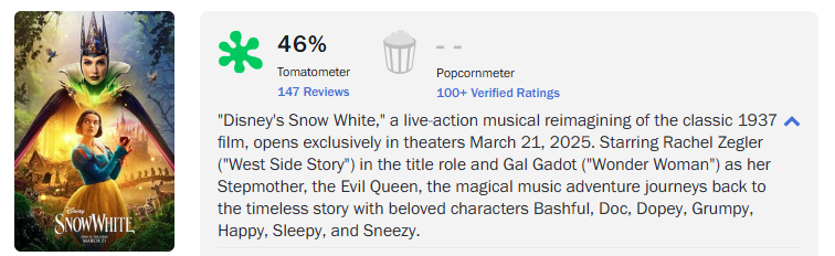 “爛番茄”網站截圖 業內媒體預測《白雪公主》的北美開畫票房會落在5000萬美元上下,全球開畫票房約在1億美元,而它的製作成本高達近2.7億美元,加上宣發費用,回本壓力不小。(完) 【編輯:丘志彬】