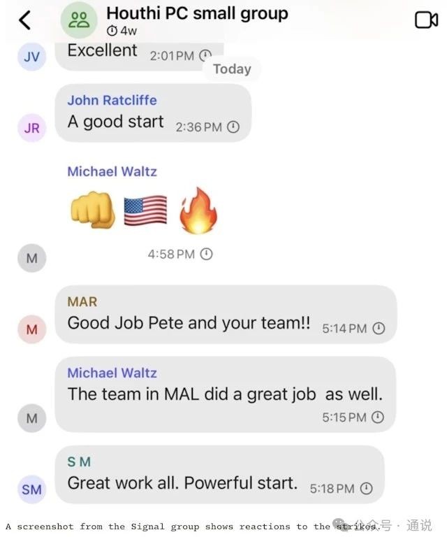 (《大西洋》月刊報道截圖) 美國國會參議院少數黨領袖、民主黨人舒默將其稱為是“很長時間以來讀到的最令人震驚的軍事情報洩密事件之一”。舒默敦促對事發原因及其後果進行全面調查:“這種安全漏洞將導致人員喪生、國家安全陷入危機,這些人顯然不能勝任這份工作”。 對於這件事,大家震驚的點有幾個: 一是如此高機密的軍事行動,竟然是通過一個聊天群來進行討論,這引發了大家對於美國涉密文件安全的質疑。因為此次事件中美國高級官員們所用的Signal,雖是一款加密的通訊軟件,但實際上并不安全。該軟件曾多次遭受攻擊,2020年因代碼注入漏洞被曝光;2022年因合作夥伴導致1900名用戶電話號碼洩露;2025年更是爆出有黑客利用二維碼監控用戶對話的事件。可見,這款軟件存在著很大的安全風險。 二是在戈德堡被莫名拉進群後,這群擔負著全美國家安全保障的最高級別官員們竟無人發現,照常熱聊絕密的軍事行動細節。正如網友所說:他們連自己的聊天信息都保護不了,美國人民該如何相信他們能保護美國安全? 三是群聊中包括了很多可愛的貼圖,稀鬆平常的語氣和氣氛,就像是在閑聊家常。但他們玩笑間做下的“空襲”決定,可能讓遠在一萬公里以外的普通也門百姓無辜喪生。在首次空襲成功後,沃爾茲讚揚道:“做得太棒了”,並發出了美國國旗、拳頭和火焰的表情符號,其他高級官員也加入了群組的祝賀。