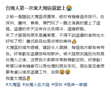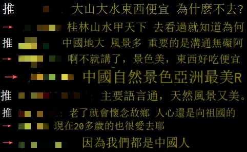 台灣網友評論截圖 消費性價比高、食物豐富好吃、服務態度好、交通便利、治安良好等也是台灣網友頻頻點讚的原因。在諸多優點面前,不少網友表示自己的深綠長輩都“無法拒絕”。還有台灣網友表示,大家喜歡赴陸旅遊是源於兩岸民眾同根同源、同文同種:“只有同文同宗的人才能從文化上理解”、“因為我們都是中國人”“老了就會懷念故鄉,人心還是向祖國的”。 值得注意的是,不僅台灣的“銀髮族”愛赴陸旅遊,台灣網友直言“年輕人也愛去啊!” 有些台媒過去總愛提“出於政治考量,台灣年輕人不愛去大陸旅遊”,但事實上,“政治”困不住台灣青年奔向大陸的雙腳,蒙蔽抹黑的話術蓋不過台灣青年分享的真實赴陸感受。