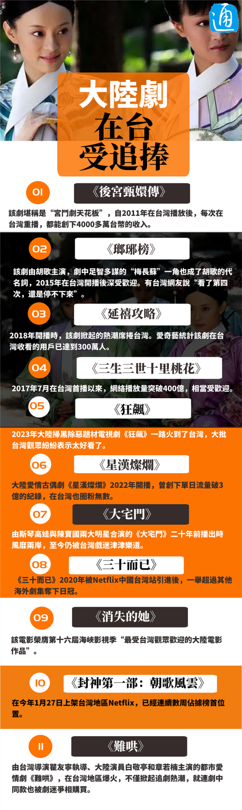 香港新聞網3月26日電 近年來,大陸影視作品製作精良,持續在台灣引發追劇熱潮。從《甄嬛傳》到《瑯琊榜》,從《延禧攻略》到《狂飆》,再到近期的《難哄》,這些大陸劇都曾風靡台灣~