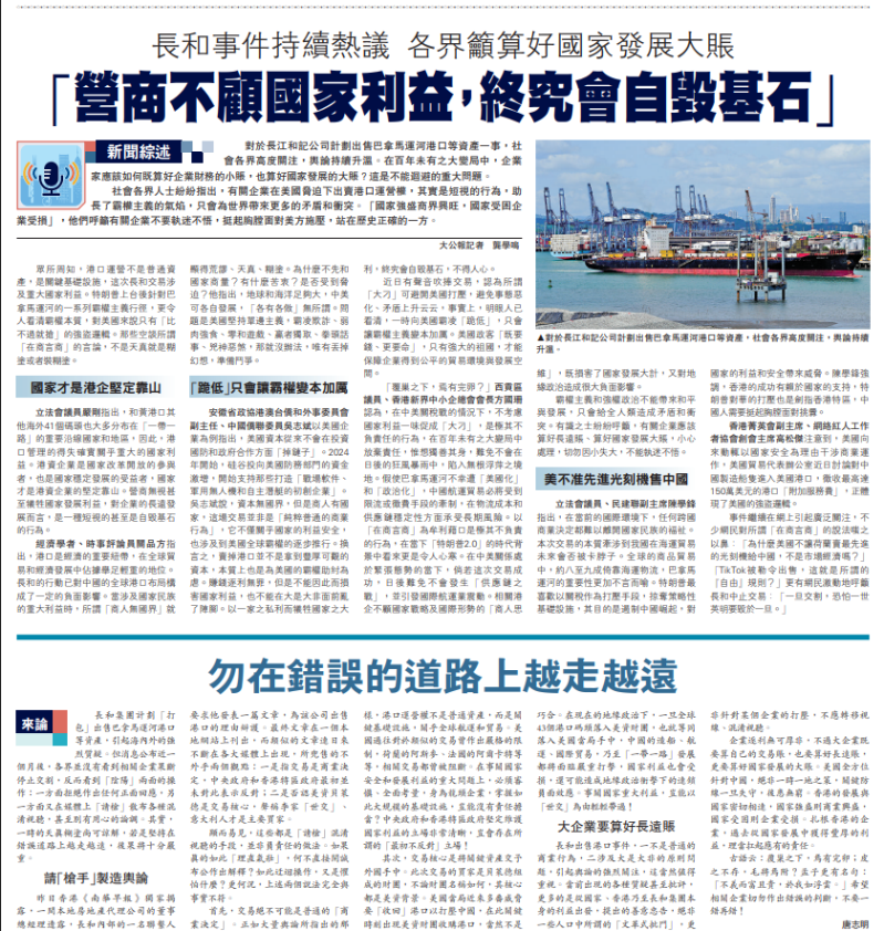 25日香港《南華早報》獨家揭露,一間本地房地產代理公司的董事總經理透露,長和內部的一名聯繫人要求他發表一篇文章,為該公司出售港口的理由辯護。大公報評論文章指出,類似的文章連日來不斷在各大媒體上出現,所兜售的不外乎兩個觀點:一是指交易是商業決定,中央政府和香港特區政府最初並未對此表示反對;二是否認美資貝萊德是交易核心,聲稱李家“世交”、意大利人才是主要買家。 文章分析,長和出售港口事件,一不是普通的商業行為,二涉及大是大非的原則問題,引起輿論的強烈關注,這當然值得重視。當前出現的各種質疑甚至批評,更多的是從國家、香港乃至長和集團本身的利益出發,提出的善意忠告,絕非一些人口中所謂的“文革式批鬥”,更非針對某個企業的打壓,不應轉移視線、混淆視聽。 “香港的發展與國家密切相連,國家強盛則商業興盛,國家受困則企業受損。扎根香港的企業,過去從國家發展中獲得豐厚的利益,理當扛起應有的責任。”文章引述古語“覆巢之下,焉有完卵;皮之不存,毛將焉附?”“不義而富且貴,於我如浮雲。”希望相關企業切勿作出錯誤的判斷,不要一錯再錯!(完) 【編輯:陳卓儀】