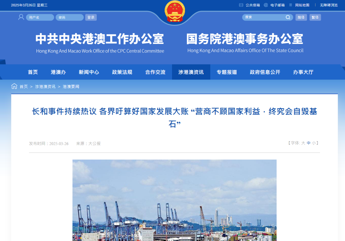 港澳辦26日再轉《大公報》文章:營商不顧國家利益,終究會自毀基石香港新聞網3月26日電 港澳辦26日再轉載《大公報》涉長和擬出售巴拿馬事件的評論文章。題為《長和事件持續熱議 各界籲算好國家發展大賬 “營商不顧國家利益,終究會自毀基石”》以下為原文: 對於長江和記公司計劃出售巴拿馬運河港口等資產一事,社會各界高度關注,輿論持續升溫。在百年未有之大變局中,企業家應該如何既算好企業財務的小賬,也算好國家發展的大賬?這是不能回避的重大問題。 社會各界人士紛紛指出,有關企業在美國脅迫下出賣港口運營權,其實是短視的行為,助長了霸權主義的氣焰,只會為世界帶來更多的矛盾和衝突。“國家強盛商界興旺,國家受困企業受損”,他們呼籲有關企業不要執迷不悟,挺起胸膛面對美方施壓,站在歷史正確的一方。 眾所周知,港口運營不是普通資產,是關鍵基礎設施,這次長和交易涉及重大國家利益。特朗普上台後針對巴拿馬運河的一系列霸權主義行徑,更令人看清霸權本質,對美國來說只有“比不過就搶”的強盜邏輯。那些空談所謂“在商言商”的言論,不是天真就是糊塗或者裝糊塗。 國家才是港企堅定靠山 立法會議員嚴剛指出,和黃港口其他海外41個碼頭也大多分布在“一帶一路”的重要沿線國家和地區,因此,港口管理的得失確實關乎重大的國家利益。港資企業是國家改革開放的參與者,也是國家穩定發展的受益者,國家才是港資企業的堅定靠山。營商無視甚至犧牲國家發展利益,對企業的長遠發展而言,是一種短視的甚至是自毀基石的行為。 經濟學者、時事評論員關品方指出,港口是經濟的重要紐帶,在全球貿易和經濟發展中占據舉足輕重的地位。長和的行動已對中國的全球港口布局構成了一定的負面影響。當涉及國家民族的重大利益時,所謂“商人無國界”就顯得荒謬、天真、糊塗。為什麼不先和國家商量?有什麼苦衷?是否受到脅迫?他指出,地球和海洋足够大,中美可各自發展,“各有各做”無所謂。問題是美國堅持單邊主義,霸淩欺詐、弱肉強食、零和游戲、贏者獨取、拳頭話事、兇神惡煞,那就沒辦法,唯有丟掉幻想,准備鬥爭。