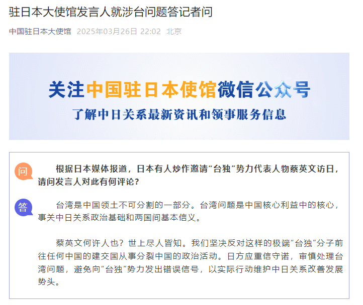 香港新聞網3月27日電 中国驻日本大使馆发言人3月26日就涉台问题答记者问。