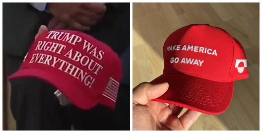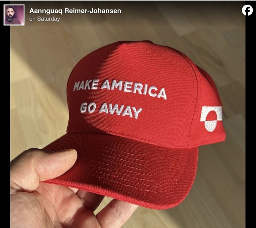 “特朗普一切都是對的”帽子(左)、“讓美國滾開”帽子(右) 在美國副總統夫人烏莎·萬斯率代表團訪問格陵蘭島之際,格陵蘭島的創作者安瓜克·雷默-約翰森(Aannguaq Reimer-Johansen)3月23日在海外社交平台臉書(Facebook)上分享他設計的“讓美國滾開”帽子,并且迅速在網絡走紅,截至目前已獲得超千次轉發。