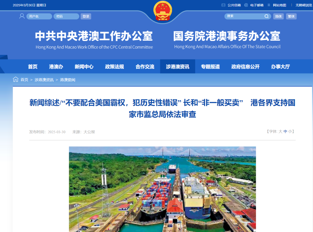 港澳辦轉大公報新聞綜述:不要配合美國霸權,犯歷史性錯誤香港新聞網3月30日電 國務院港澳辦30日在官網轉載香港《大公報》新聞綜述,涉長江和記公司計劃出售巴拿馬運河港口等資產。以下為原文: