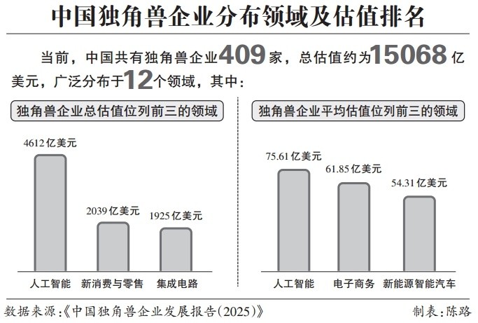 數據來源:《中國獨角獸企業發展報告(2025)》 估值超過百億美元的有18家 《環球時報》援引《報告》稱,從分布領域看,中國獨角獸企業分布於集成電路與半導體、軟件與信息服務、新能源技術、人工智能、智能製造、新消費等12個領域。其中,人工智能、新消費與零售以及集成電路領域的獨角獸企業總估值位列前三,分別為4612億美元、2039億美元、1925億美元。從平均估值看,人工智能、電子商務、新能源智能汽車領域獨角獸企業位列前三,分別為75.61億美元、61.85億美元、54.31億美元。估值超過百億美元的超級獨角獸企業有18家。 從數量來看,新消費與零售、人工智能、集成電路、智能裝備、醫藥健康領域的企業數量位列前五,分別為66家、61家、54家、54家、43家,合計占比68%。 北京芯馳半導體科技股份有限公司創始人仇雨菁表示,中國龐大的市場為本土獨角獸企業提供了獨特的優勢。尤其是在汽車智能化、電動化的趨勢下,大量創新企業迅速崛起,本土的供應鏈也隨之飛速發展。 她舉例說,中國在汽車半導體產業方面的創新能力正在不斷提升,為全球市場提供了更多的可能性。 牛津大學領導委員會成員戴維·約翰遜表示:“中國的獨角獸企業是一個奇跡。中國政府幫助中國的獨角獸企業發揮最大的潛力,而歐美地區更多尋求的是獨角獸產業的商業化,而非鼓勵創新。” 各國獨角獸企業仍有巨大發展潛力 北京市政府副秘書長許心超在論壇上表示,儘管全球獨角獸企業正在蓬勃發展,但仍需要清晰地看到當前全球獨角獸企業的發展面臨諸多瓶頸,比如創新與人才短缺、國際貿易壁壘以及安全性問題。 根據長城戰略咨詢去年7月發布的《GEI世界獨角獸企業發展報告2024》,在烏克蘭危機、能源價格飈升等宏觀因素的作用下,2022年全球經濟逐漸步入增長乏力狀態,獨角獸企業數量的增速也在放緩。 戴維·約翰遜表示,中國和世界其他地區的獨角獸企業仍有巨大的發展潛力。他認為,新的機會總是在不斷湧現,尤其是在人工智能、綠色技術等領域。他建議繼續在這些領域開展聯合研發,比如推動環境保護、發展綠色經濟等。他強調,面對這些挑戰,各國企業必須攜手合作,因為“一個人的力量終究是有限的”。 國際大學創新聯盟的孫萬松在論壇上提到,目前歐洲的獨角獸企業估值嚴重被低估。他表示,歐洲的獨角獸企業應該與中國的企業和市場開展深度合作。未來,全球範圍內的科技合作和市場合作將成為全球獨角獸企業最重要的需求。 合作應對多重挑戰 談及中國獨角獸企業如何更好地發揮作用,戴維·約翰遜表示,需要思考如何將在中國開發的、產生巨大影響的技術和產品進行推廣,更好地在全世界開拓市場。他認為,答案就是繼續促進合作,并在貿易領域保持開放和尊重,“為了讓全球獨角獸產業繼續蓬勃發展,我們需要開放的市場,需要進步的理念。” 仇雨菁表示,以汽車半導體產業為例,加強國際合作是提升汽車芯片產業國際競爭力的重要途徑。汽車芯片企業全球化,一方面需要持續踐行車規認證領域國際及國內最高安全標準和相關法規的要求,另一方面還要積極拓展國際合作。 除獨角獸企業外,瞪羚企業作為高成長性科技型企業的代表,也開始受到更多關注。瞪羚企業通常具有成長速度快、創新能力強、發展潛力大的特點,更多地聚焦於中小企業群體。與獨角獸企業不同,瞪羚企業更多的是跨過創業初期後,在較短時間內以超常規速度發展,并且在技術、商業模式或產業組織形式上具有強大的創新能力。(完) 【編輯:李雪萍】