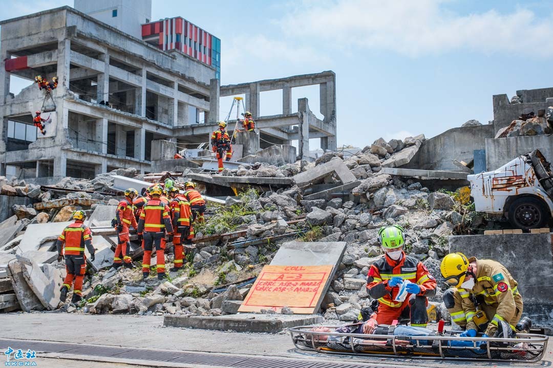 香港消防處聯同廣東省消防救援總隊和澳門消防局3月25日起一連三日聯合舉辦粵港澳大灣區應急救援聯合演練“聯城──2025”。演練模擬香港出現極端情況,導致救援資源緊張,香港特區政府向廣東省政府和澳門特區政府提出支援請求,三地人員在多個災難場景進行聯合救援演練。圖為3月26日在香港消防及救護學院舉行的聯合演練。(香港中通社記者 許其皓攝)