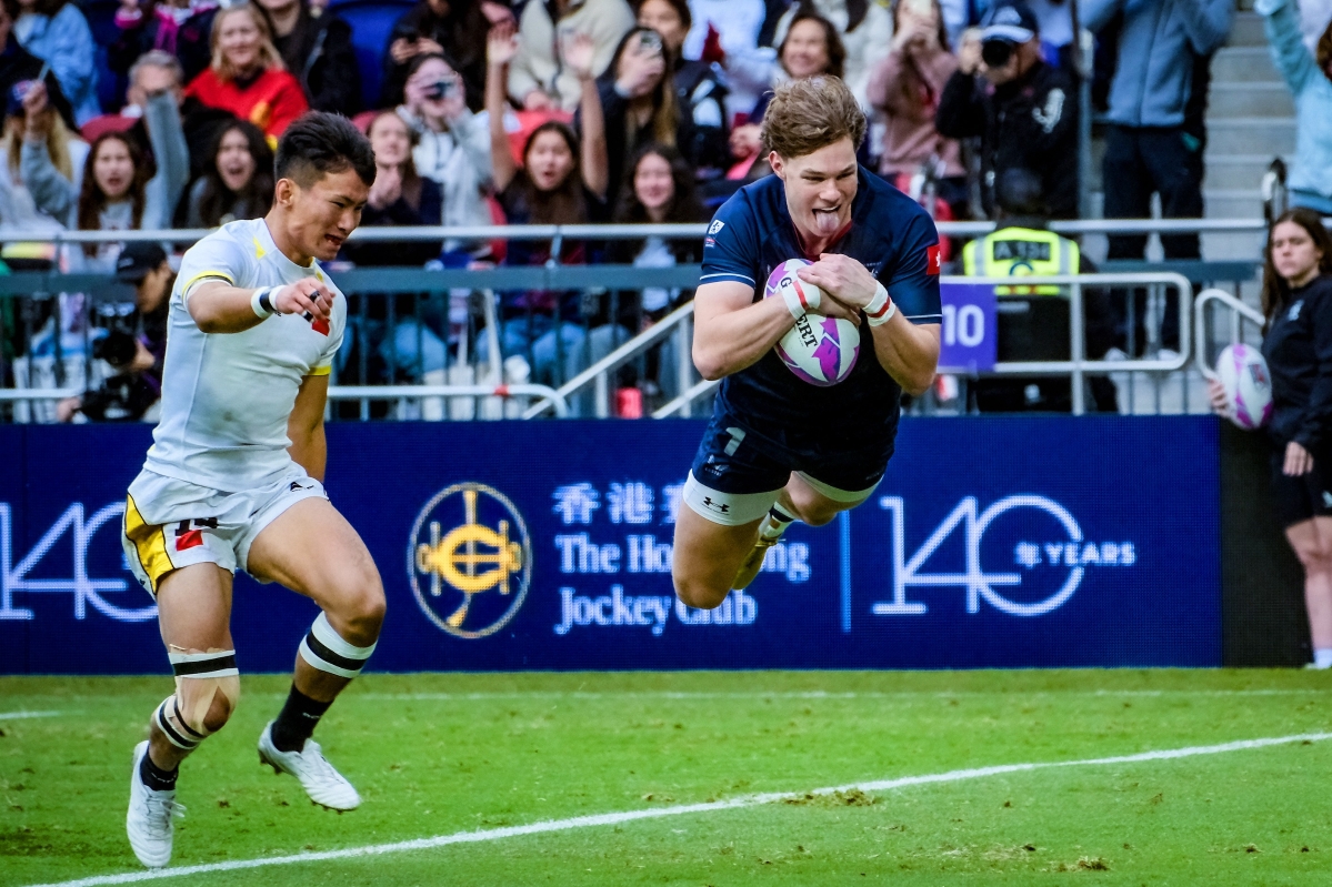 3月30日,香港國際七人橄欖球賽最後一個比賽日,中國香港男子隊(藍)以38:5戰勝中國男子隊(白),奪得銀劍賽男子組冠軍。(香港中通社記者 許其皓攝)
