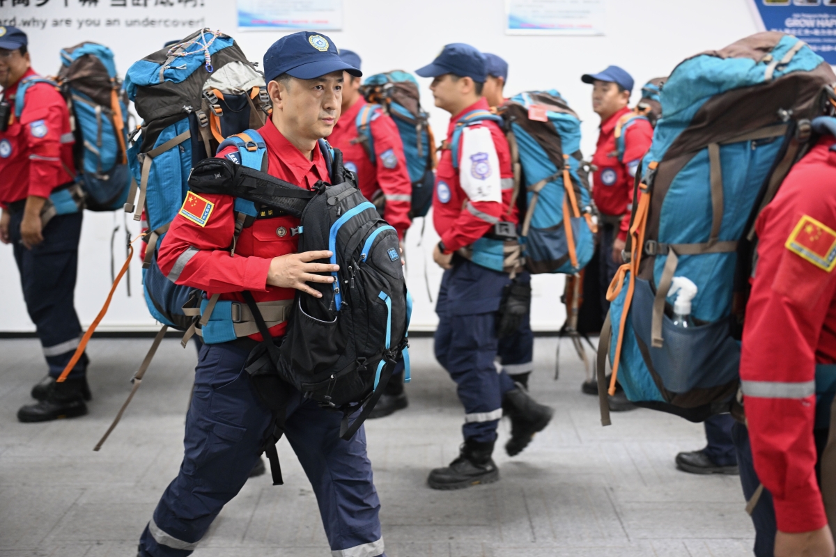 3月29日下午,深圳公益救援隊組織首批23名專業救援隊員和一條搜救犬,攜救援裝備集結出發馳援緬甸地震災區。(聞子 攝)
