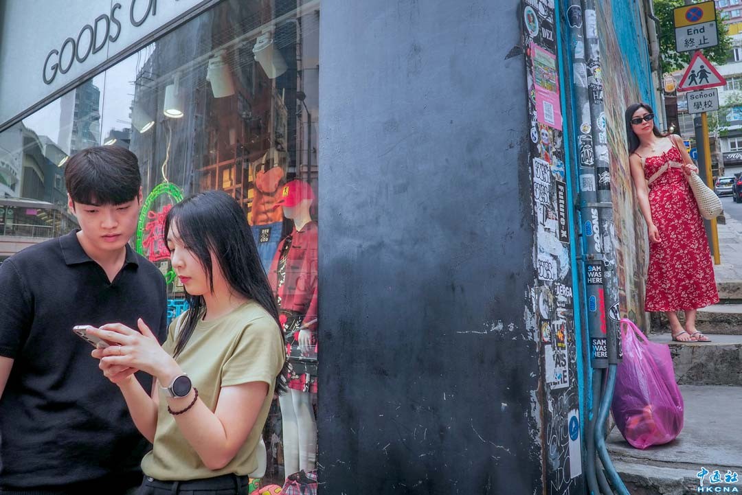 香港最大型街頭藝術節— HKwalls 每年在香港藝術3月舉行,多年來 HKwalls 的足跡遍佈中上環、灣仔、黃竹坑等地區,吸引不少人去打卡。HKwalls 2025年踏入10週年,今年在3月22日至30日一連九日,邀請到14位來自歐洲、大洋洲及亞洲的海外藝術家,聯同6位中國內地藝術家及10位香港本地藝術家帶來全新街頭壁畫創作,把港島西區大街小巷變成他們的巨型畫布,為城市景觀添上趣味及濃厚藝術氛圍。圖為3月28日韓國遊客在街頭感受香港藝術3月氣氛。 (香港中通社記者 洪少葵攝)