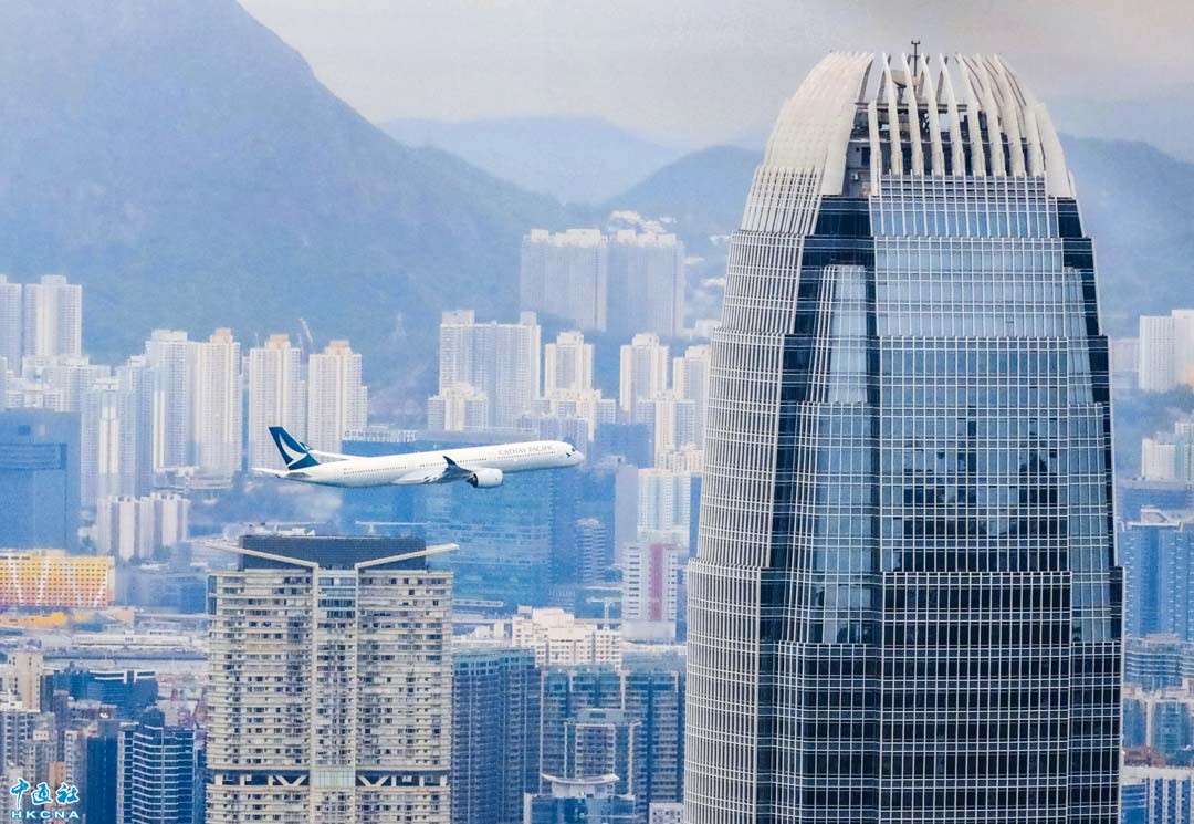 3月30日下午,為紀念香港啟德機場100周年,國泰航空A350客機飛越維港,低飛到啟德體育園上空附近。當天香港市區天氣清涼,市民熱情不減。在港島太平山上一早集聚大批市民,準備一睹國泰飛機低飛的壯觀畫面。下午4時許,國泰飛機來回飛越維港,低飛國際金融中心,市民紛紛舉起手機、相機歡呼拍攝。(香港中通社記者 洪少葵攝)