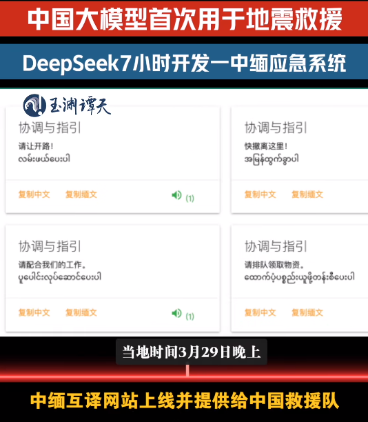 “玉淵譚天”視頻截圖 據了解,該系統是國家應急語言服務團秘書處和北京語言大學迅速組建的語言服務支持團隊,利用DeepSeek在僅僅7小時內開發出來的,至今緬甸已有700餘人持續使用該平台。 中國官媒央視旗下“玉淵譚天”4月1日發布視頻,梳理了DeepSeek 7小時攻克緬甸救災語言關的關鍵資訊。該系統的開發者介紹稱,依賴大模型並融合術語,同時融合已有的知識庫的,會比傳統的機器翻譯品質要高很多。開發過程中,先用DeepSeek生成了50句關於地震救災的應急用語,再把它以中文、緬甸語、還有發音同時呈現在一個頁面裡。經多名緬甸語留學生體驗後,中緬互譯網站上線並提供給中國救援隊。 後來在救援過程中,在中國救援隊建議和要求下,又陸續上線了語音翻譯功能、地名翻譯功能。開發者表示,在緬甸救援結束後,會把這個平台開源出來,讓更多人知道、使用,讓更多救援團隊可以在本地部署。 “國家應急語言服務團”是由中國教育部、國家語委、應急管理部等部委指導成立的公益聯盟組織,主要任務是針對各類突發公共事件應急處置及國家其他領域重要工作中急需克服的語言障礙,提供國家通用語言文字、少數民族語言文字、漢語方言、手語、盲文、外國語言文字等方面的語言服務,是國家語言服務體系的重要組成內容。本次通過語言技術服務國際救援,充分體現了語言文字助力構建人類命運共同體的獨特作用。 根據緬甸氣象水文部門最新公布的數據,自3月28日緬甸中部發生強烈地震以來,截至當地時間4月2日早上,共報告54次餘震,震級從2.8級至7.5級不等。緬甸領導人敏昂萊4月1日表示,強震已造成2719人遇難,4500多人受傷,另有440多人失蹤。緬甸政府將3月31日至4月6日定為緬甸地震全國哀悼周。(完) 【編輯:石歡歡】