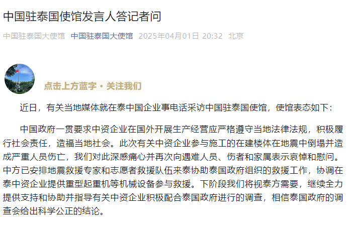 圖源:中國駐泰國大使館微信公眾號截圖 中使館官網發文指,中國政府一貫要求中資企業在國外開展生產經營應嚴格遵守當地法律法規,積極履行社會責任,造福當地社會。“此次有關中資企業參與施工的在建樓體在地震中倒塌並造成嚴重人員傷亡,我們對此深感痛心並再次向遇難人員、傷者和家屬表示哀悼和慰問。” 文章指,中國已安排地震救援專家和志願者救援隊伍到泰國,協助泰國政府組織的救援工作,協調在泰中資企業提供重型起重機等機械設備參與救援。 中使館表示,下階段將視泰方需要,繼續全力提供支持和協助,並指導有關中資企業積極配合泰國政府進行的調查,相信泰國政府的調查會給出科學公正的結論。 泰國國家審計署大樓由意大利——泰國發展公司(簡稱意泰公司)與中國國企中鐵十局集團聯合承建,是曼谷唯一受緬甸強震影響倒塌的建築物,引起大眾關注。 受緬甸強震影響,泰國至今確認21人死亡,還有70多人失聯,相信大部分受困廢墟下。(完) 【編輯:彭玉婷】