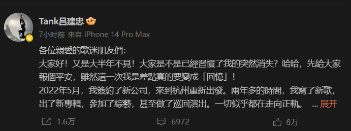 去年11月,一位因特重度顱腦損傷致腦死亡的大愛者無私地捐獻了器官。此後,Tank在浙大二院進行了“心肝同期聯合移植手術”。 今年4月7日下午,Tank在個人微博發布長文回應此事。他寫道,“浙大二院迅速集合了各個專業團隊,根據之前制定的手術方案進行細致的術前討論,並在各方配合下完成了心肝同期聯合移植手術。手術整整持續了12個小時......術後,我迎來了非常痛苦的恢復期,克服了重重的困難,一次次在鬼門關前徘徊。今天我走出了醫院,身體已經基本康復“。 他表示,“感謝祖國,感謝杭州,這是最堅強的後盾,支撐我度過人生最大的難關"。 據公開資料,Tank本名呂建忠,1982年2月6日出生於台東縣。他有大量傳唱度頗高的作品,如《給我你的愛》 《三國戀》《千年淚》《專屬天使》《非你莫屬》等。2007年,因為家族遺傳性心臟病,他意外暈倒在舞台上。從此,一枚“起搏器”植入他的心臟。而就在Tank病發的前一年,他的姐姐因心臟病在熟睡狀態下猝死。《如果我變成回憶》這首歌就是他為紀念姐姐而創作的。(完) 【編輯:李濼】