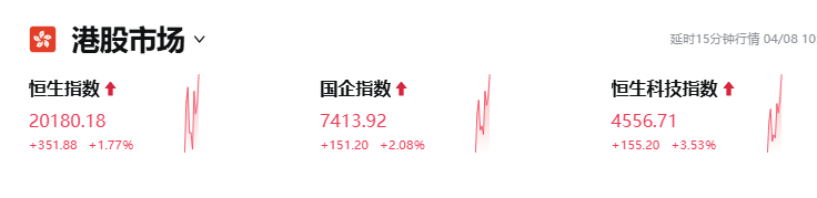 香港新聞網4月8日電 港股開盤強勢反彈,站穩兩萬點。恒生指數漲1.77%,恒科指漲3.53%。科指成分股中,網易-S漲9.8%,京東集團-SW漲10.21%,地平線機器人-W漲9.96%,小鵬汽車-W漲6.15%,小米集團-W漲8.5%,蔚來-SW漲5.51%,阿里巴巴-W漲4.41%。