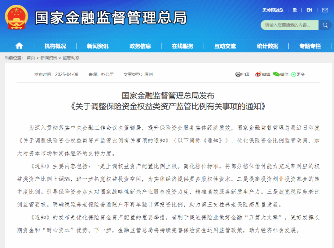 香港中通社4月8日電 中國國家金融監管總局8日對外發布《關於調整保險資金權益類資產監管比例有關事項的通知》,上調權益類資產配置比例上限,提高投資創業投資基金的集中度比例,放寬稅延養老比例監管要求。將部分檔位償付能力充足率對應的權益類資產比例上調5%,進一步拓寬權益投資空間,為實體經濟提供更多股權性資本。