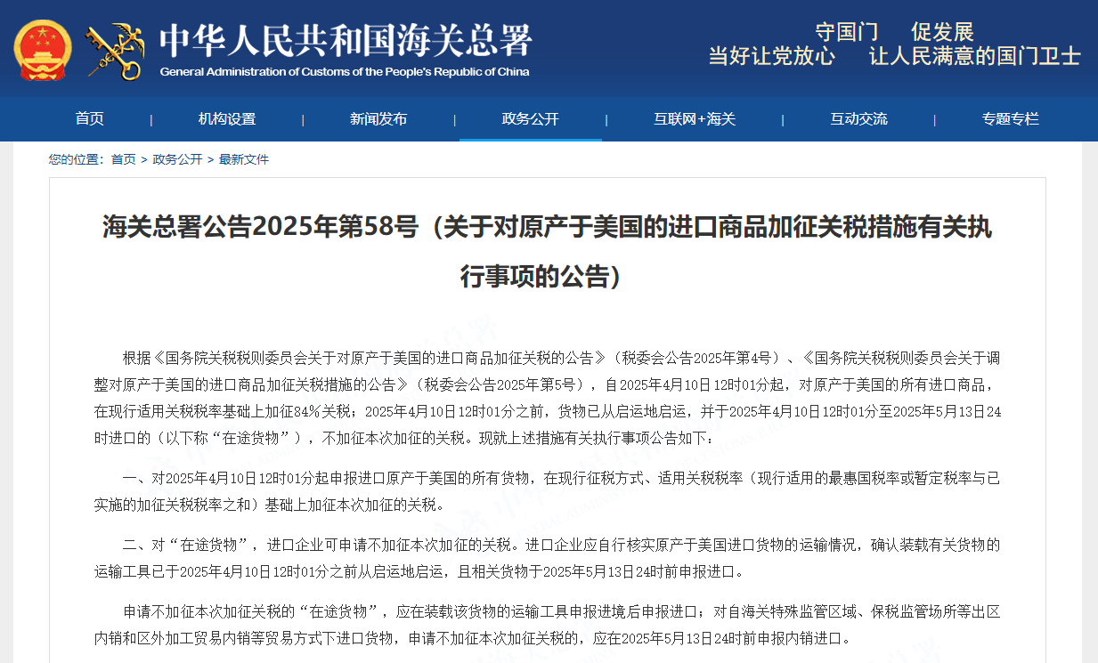 香港新聞網4月10日電 中國國務院關稅稅則委員會4月9日發布公告,自4月10日12時01分起,對美所有進口商品加徵關稅至84%。同日,中國海關總署就有關執行事項發布公告,稱自4月10日12時01分起,對原產於美國的所有進口商品,在現行適用關稅稅率基礎上加徵84%關稅;4月10日12時01分之前,貨物已從啟運地啟運的,並於4月10日12時01分至5月13日24時進口的(下稱“在途貨物”),不加徵本次加徵的關稅。