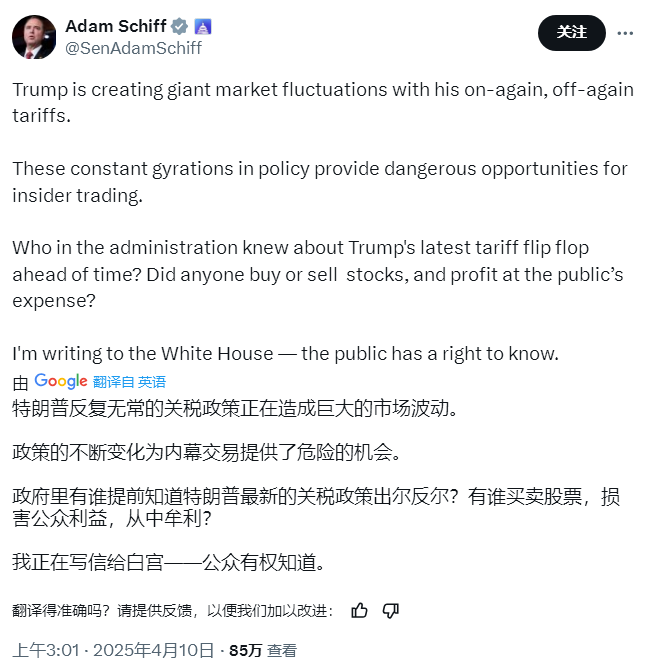 社交平台截圖 多位美國民眾黨眾議員也抨擊特朗普此次行為,並呼籲就此次事件發起調查。 康涅狄格州民主黨參議員理查德·布盧門撒爾(Richard Blumenthal)大罵特朗普政府“充斥著騙子”,“腐敗就是它的中間名”。 布魯門撒爾表示:“內幕交易是一個真正的威脅,我希望能够加大對證券操縱和內幕交易可能性的深入調查,因為特朗普的計劃已經和可能是什麼已經廣為人知。” 加州民主黨參議員亞當·希夫(Adam Schiff)也表示有必要對此次事件進行調查。他在社交媒體上寫道:“特朗普反復無常的關稅政策正在造成巨大的市場波動。這些政策的不斷變化為內幕交易提供了危險的機會。政府裡有誰提前知道特朗普最新的關稅政策轉變?有人買賣股票,并以犧牲公眾利益為代價獲利嗎?我在給白宮寫信——公眾有權知道。”