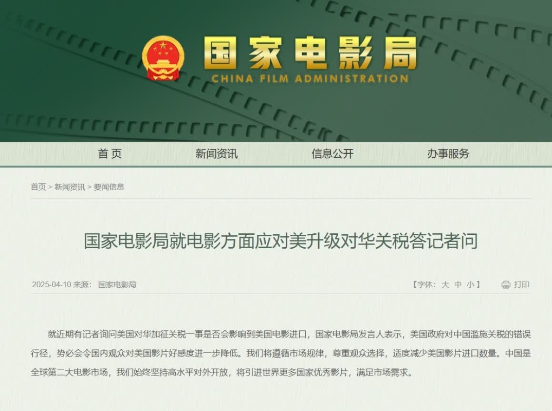 香港中通社4月10日電 中國國家電影局10日表示,美國政府對中國濫施關稅的錯誤行徑,勢必會讓中國國內觀眾對美國影片好感度進一步降低,將遵循市場規律,尊重觀眾選擇,適度減少美國影片進口數量。 發言人說,中國是全球第二大電影市場,中方始終堅持高水平對外開放,將引進世界更多國家優秀影片,滿足市場需求。 另外,中國教育部9日發布2025年第1號留學預警。教育部稱,近日,美國俄亥俄州通過有關高等教育法案,其中包含涉華消極條款,對中美高校教育交流合作施加限制。教育部提醒廣大留學人員,近期選擇赴美有關州學習時做好安全風險評估,增強防範意識。