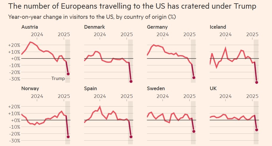 赴美旅遊人數銳減,沒想到歐洲人如此討厭特朗普……香港新聞網4月14日電 美國總統特朗普上台後,把美歐跨大西洋關係攪得一團糟。據英國《金融時報》4月12日報道,由於特朗普政府收緊移民和入境政策,同時對歐洲國家施壓關稅和安全威脅,美國旅遊業遭受嚴重衝擊,前往美國的歐洲遊客數量急劇下降……