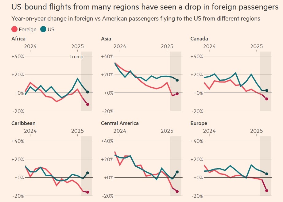 許多地區赴美航班的外國乘客數量都有所下降。英國《金融時報》製圖 旅遊預訂網站Omio首席執行官納倫·沙姆表示,第一季度,前往美國的預訂取消率比2024年同期高出 16%,而來自英國、德國和法國的遊客的取消率甚至更高,達到40%。 法國酒店巨頭雅高集團首席執行官塞巴斯蒂安·巴贊表示,有關美國邊境拘留的報道,給前往美國的遊客產生了“負面影響”。雅高集團4月初表示,今年夏天前往美國的歐洲遊客預訂量下降了25%。 據法新社3月20日報道,一名法國科學家近期前往美國參加會議時,被美國拒絕入境。法國政府方面表示,原因是機場的美國移民官員在檢查他的手機時發現了批評特朗普政府的聊天記錄。美國官方反駁了這一控訴,聲稱該學者掌握了進行敏感科學研究的機密信息,違反了保密協議。 這名法國科學家的經歷并非孤例。英國《金融時報》指出,特朗普上台後,收緊移民和入境政策,大批來自歐洲和加拿大遊客在入境時遭受美國邊防警衛的敵意。 目前,多個歐洲國家已更新了旅行警告,以應對這一變化。英國政府指出,美國邊境當局“嚴格制定和執行入境規則”,并警告旅行者“如果違反規定,可能會被逮捕或拘留”。德國、丹麥等一些歐洲國家還向跨性別遊客發出了特別警告。 報道稱,赴美國際遊客數量的下降,凸顯了特朗普政府激進邊境政策可能對經濟造成的影響。 數據顯示,去年國際遊客在美國旅行及旅遊相關商品和服務上的支出超過2530億美元,占2024年美國1.3萬億美元旅行支出的19%以上。美國旅遊協會對“令人擔憂的趨勢”發出了警告,并將其歸因於包括“美國受歡迎程度下降”在內的因素。 美國內華達大學拉斯維加斯分校旅遊業專家瑪塔·索利戈日前表示:“遊客們處於壓力之下,不希望任何事情讓旅途變得更加艱難。人們正認真考慮是否應前往美國旅遊,這對美國旅遊業來說是一個巨大的擔憂。” 英國藝術家兼作家格洛麗亞·辛克表示,在看到有關遊客被拘留的報道後,她取消了5月份前往舊金山的旅行。辛克是一名跨性別女性,她擔心自己的身份會在邊境引發“不必要的關注”。“邊境似乎不安全。說實話,我不知道自己去了美國後還能不能回來。” 特朗普的關稅等各項政策,導致居住在巴黎的英國退休人員保羅·哈靈頓取消了2026年前往華盛頓特區的行程。他說:“我現在正在邀請我的美國朋友來巴黎。特朗普下台之前,我不會踏進美國。”(完) 【編輯:許豐悅】