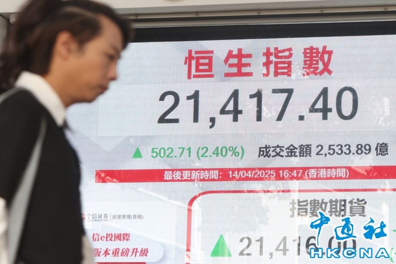 香港中通社4月14日電(記者 徐嘉儀)美股三大指數上周五造好,亞洲股市14日反彈,港股恆生指數收報21417點,升502點,成交2533億港元。至此,恆指連升五個交易日,共漲1589點。