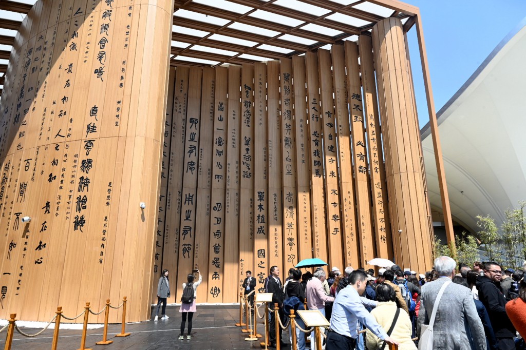 4月14日,日本大阪,遊客排隊參觀中國館。澎湃新聞 中國館竹黃色外立面以金、篆、隸、行、楷 5 種字體鐫刻著119句經典詩詞,涵蓋《詩經》《楚辭》、四書五經等經典著作。從《詩經》中 “關關雎鳩,在河之洲” 的純真質樸,到《楚辭》裡“路漫漫其修遠兮,吾將上下而求索”的浪漫與堅毅,這些詩詞跨越時空,如同一座文化寶庫,讓每一位觀者都能感受到中華文化的博大精深。