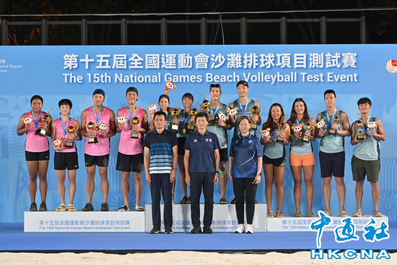 •   第十五屆全國運動會沙灘排球項目測試賽4月20日在銅鑼灣維多利亞公園完成最後一日賽事。圖為全國運動會香港賽區統籌辦公室主任楊德強(前排中)、國家體育總局排球運動管理中心沙灘排球部副主任劉冰(前排左)和中國香港排球總會董事石徐惠芬(前排右)頒獎予勝出隊伍。 香港中通社圖片