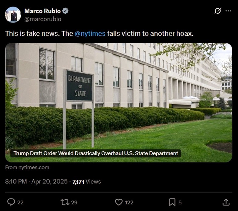 美國國務卿魯比奧帖文。社媒X截圖 彭博社則引述一名匿名美國駐非洲高級官員的說法披露,美國國務院內部目前流傳的、預計最快下周二(22日)公佈的改革方案,其實會比媒體洩露的草案內容“溫和得多”。在社交媒體上,有美國務院雇員懷疑,被洩露給媒體的草案只是轉移注意力的策略性放風。 “我懷疑這是被洩露出來轉移注意力的‘煙霧彈’,目的是讓我們對最終推出一個較溫和、但仍不受歡迎的版本感到‘感激’。當前基本上會立刻被起訴并被法院叫停,之後的‘實施’過程也會被一拖再拖,直到特朗普被選下台。”一名用戶寫道。 《紐約時報》分析,草案中提出的一些變動,如大規模關閉外交使團和總部機構,以及對外交體系的重組,將需要通知美國國會,毫無疑問將面臨議員的強烈挑戰。如果政府官員試圖推動實施草案中的大部分內容,很可能會遭遇法律訴訟。 據美國國務院網站介紹,美國務院當前約有1.3萬名外交人員、1.1萬名公務員,以及在全球270多個外交使團雇傭的4.5萬名當地雇員。本周稍早有美媒披露,特朗普政府正在考慮將美國國務院下一年度的預算支出削減近一半,并關閉10個駐外使館和17個駐外領事館。 媒體當時援引美國國務院的內部備忘錄報道說,計劃關閉的駐外使館主要位於非洲地區,計劃關閉的領事館主要位於歐洲地區。這些使領館關閉後,其職能將由相鄰地區的使領館負責。美國還計劃大幅削減在伊拉克、索馬裡等地的外交預算。(完) 【編輯:豐悅】