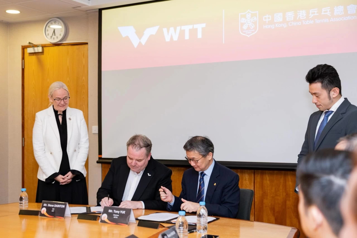 香港新聞網4月21日電 中國香港乒乓總會(乒總)宣布,香港與世界乒乓球職業大聯盟(WTT)達成長期協議,將主辦大型的WTT 賽事,而首場主辦賽事將是2025年12月10日至14日在香港體育館舉行的2025總決賽,有關簽約儀式亦於2025年4月17日在國際乒乓球聯合會會長 Petra SORLING 女士及中國香港乒乓球代表隊黃鎮廷先生見證下由乒總主席餘國樑先生及世界乒乓球職業大聯盟(WTT)行政總裁Steve DAINTON 先生簽署,一眾中國香港乒乓球代表隊成員亦有出席表示支持。