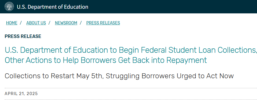 美國政府宣布:將向500多萬人進行“強制討債”香港新聞網4月22日電(編輯 丘志彬)美國教育部準備於今年5月恢復對違約聯邦學生貸款的催收工作。這一決定意味著,將有超500萬的美國人面臨被政府“強制討債”的窘境。