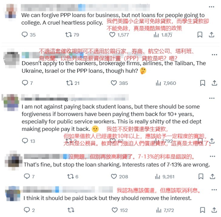 美國教育部新聞稿:教育部將開始追收聯邦學生貸款,并採取措施讓借款人恢復還款 根據美國教育部當天發布的文件顯示,目前4270萬借款人欠下的學生債務超過 1.6 萬億美元,只有38%的借款人正在償還學生貸款。其餘大多數借款人要麼拖欠還款,要麼處於免息寬限期,要麼處於免息延期。 其中,超過500萬借款人已逾期360天以上未償還月供,處於違約狀態(許多人違約時間超過7年),另有400萬借款人處於嚴重逾期階段(91-180天)。照此趨勢,未來數月違約借款人總數或將逼近千萬。屆時,將近25%的聯邦學生貸款將違約。 那麼,為什麼會有這麼多美國人違約呢? 據了解,由於美國高等教育的費用相當高昂,不少美國人會通過貸款的方式接受高等教育。但學生貸款利率相當之高,讓不少美國民眾無力支付不斷累積的利息。美國銀率網公司今年2月公布的數據顯示,當前聯邦學生貸款年利率範圍為6.53%至9.08%,由銀行等私營金融機構提供的私人學生貸款年利率最高甚至可達近18%,令人咋舌。此外,一些私人學生貸款採取利滾利的複利(利滾利)計算方式,進一步加重了借款人的償還壓力。 因此,學生貸款已成為長期困擾美國人的經濟枷鎖。據美國民間組織“教育數據倡議”統計,考慮到延期畢業、貸款利息和收入下降等因素,美國人本科畢業的總成本可能超過50萬美元。美國人還清學生貸款的平均時長是20年,就連前總統奧巴馬也是在40多歲時才還清學生貸款。 這兩天,美國教育部社交賬號下,湧入許多美國網友表達不滿。網友們指責聯邦學生貸款的催收政策“殘酷無情”,質疑為什麼美國政府可以免除企業、銀行家、券商等的貸款,卻不能免除學生貸款。並抨擊學生貸款的高額利息,諷刺聯邦學生貸款為“高利貸”。