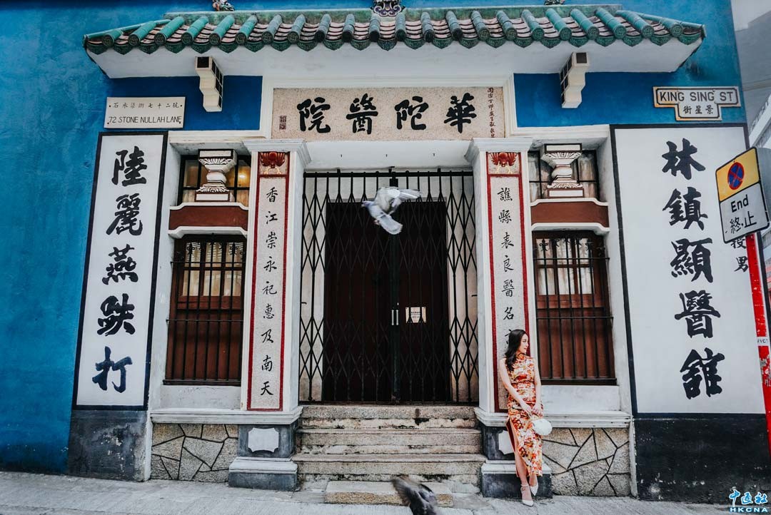 香港藍屋位置原為一所“華陀醫院”,相信是首間在香港灣仔開設的華人醫院。1886年,該院關閉,其後於1950年代改為武術學校,1960年代起方為現在的針灸診所。在1978年,業權轉交政府後外牆被塗上藍色,被稱為藍屋。藍屋樓高四層,是以灰泥抹面的磚構建築物,每道邊牆均有淺山牆端,設計典雅。圖為懷舊服飾打扮的少女在藍屋建築群打卡拍照。(香港中通社記者 曹文毓攝)