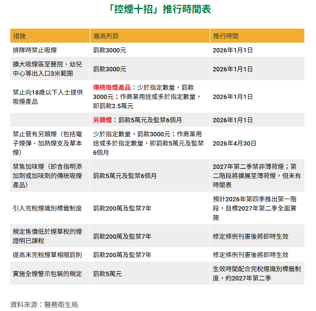 修例列明,禁止在公眾地方管有指明另類吸煙產品,如煙彈、加熱煙及草本煙,計劃明年4月30日推行。另外,亦擬禁止售賣含指明添加劑的傳統吸煙產品、以及顯示為含有加味劑的傳統吸煙產品等。政府預計,第一階段將禁售非薄荷煙,料2027年第二季實施;第二階段將擴展至薄荷煙,但未有時間表。 當局將引入完稅煙標籤制度生效日期雖尚未制定,但將預計2025第三季推出先導計劃,最快於2026年第四季推出第一階段(不論有否附貼完稅標籤均可同時在市場上出售),目標是2027年第二季全面實施。 文件指,打擊私煙放在十招中最優先位置。在完稅煙加入識別標籤,並加大走私私煙罰則,由現時買賣、管有,最高罰100萬元、入獄兩年,提升至罰200萬、監禁7年。