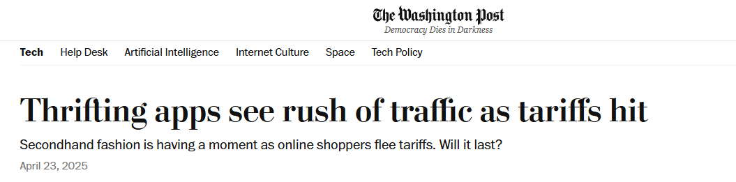 《華盛頓郵報》報道截圖 《華盛頓郵報》援引市場情報公司Sensor Tower的數據顯示,與上一季度相比,美國二手商品交易類應用程序的下載量在今年第一季度平均激增18%。部分二手商品交易平台應用程序下載量更是顯著增長:Depop增長68%,Poshmark增長28%,eBay增長15%。 這些平台上架著琳琅滿目的二手商品,從嚴重磨損到標籤未拆的全新品應有盡有,讓美國消費者可以直接從小型古著商店、專業的“升級改造者”以及衣櫃爆滿的業餘賣家那里購得二手服裝、鞋履和配飾等。 Poshmark創始人兼首席執行官曼尼什·錢德拉(Manish Chandra)表示,關稅將使得二手商品交易平台成為美國消費者“日益重要且經濟實惠的資源”。 值得一提的是,環保人士多年來一直倡議購買二手商品以減少浪費,但收效甚微,快時尚總體支出一直不斷增長。結果,沒想到這場關稅反而改變了美國人的消費習慣。 康涅狄格州律師的林賽·法爾本特(Lindsay Farbent)表示,在得知關稅可能影響其鐘愛的品牌價格後,她連忙下載兩個二手時尚交易平台。她坦言,不希望自己的衣橱“一成不變”,但物價上漲叠加潛在經濟衰退的前景,正促使她重新審視購物習慣。 法爾本特說,其實自己平時會注重環保相關問題,可之前還是購買了很多新商品,但“感覺現在不再是能這樣做的時候了”。 不過,《華盛頓郵報》提到,如果美國下調對中國商品的關稅,可能會讓消費者對二手商品的熱潮如同其迅速興起般快速消退。(完) 【編輯:丘志彬】