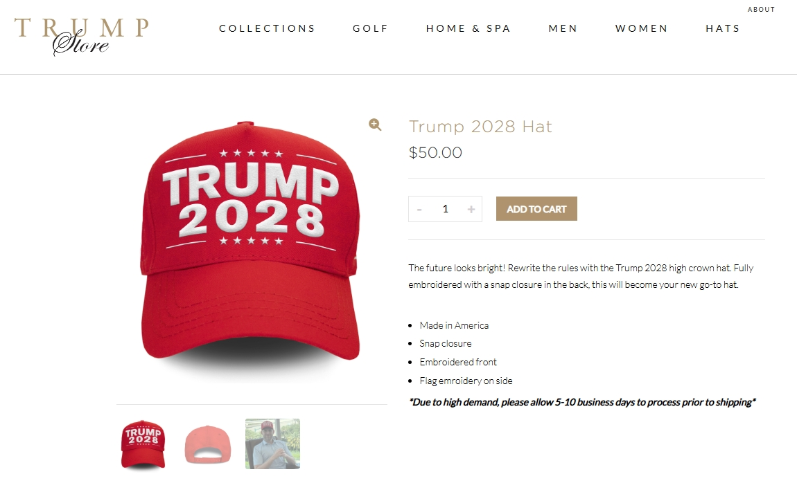 圖為此次特朗普商城推出的“特朗普2028”系列部分商品。特朗普商城網站截圖 從購物網站的詳細介紹來看,此次新推出的帽子定價為50美元,其設計風格延續了特朗普標誌性的“讓美國再次偉大”(MAGA)風格,不同之處在於帽子上醒目地印著“特朗普2028”字樣。商品介紹頁面還配有一張特朗普次子埃里克頭戴該款帽子的照片,并特意標注了是由“美國製造”。 尤為引人注目的是,產品介紹中附有明顯的政治性暗示話語。在帽子的商品頁面上,赫然寫著“未來一片光明!用特朗普2028高冠帽改寫規則”;襯衫的介紹也如出一轍,“未來一片光明!穿上新款特朗普2028 T恤,改寫規則吧”。