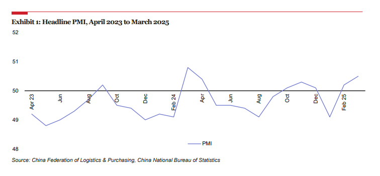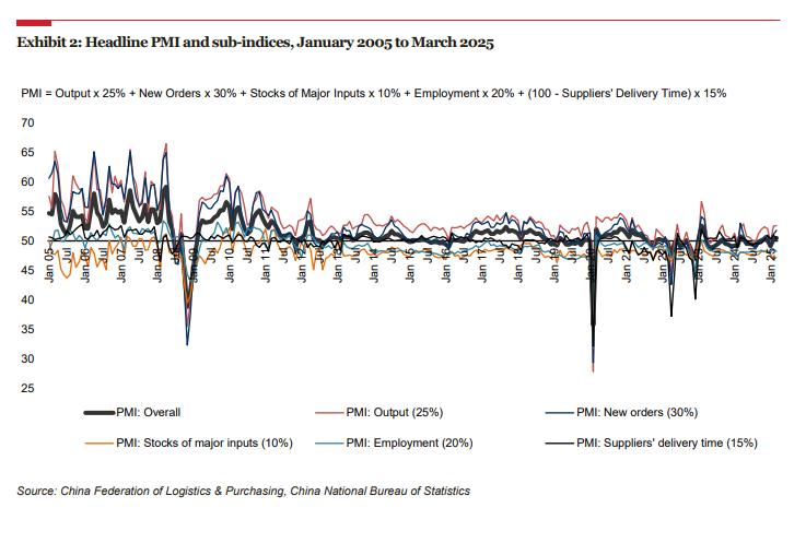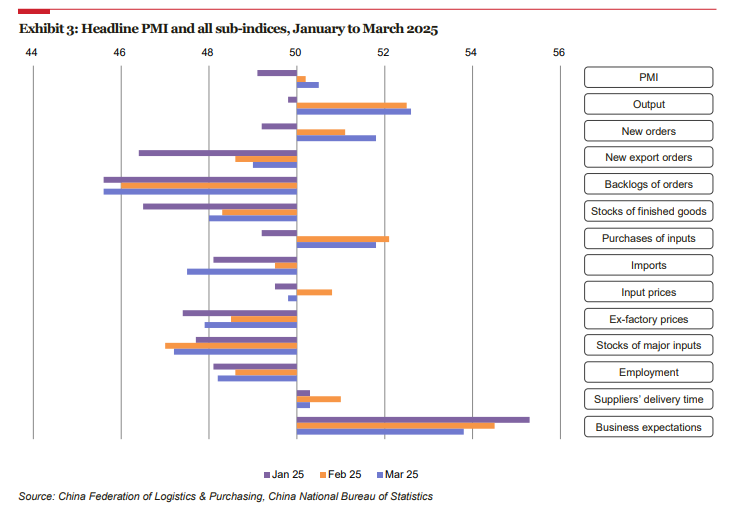 2025年第一季度總體PMI的上升主要由新訂單指數(在總體PMI計算中占30%)和產出指數(占25%)的上升驅動。在12個分項指數(即不包括供應商交貨時間指數)中,只有商業預期指數在過去三個月內一直保持在擴張區間。與此同時,新出口訂單、積壓訂單、成品庫存、主要投入品庫存、進口、出廠價格和就業等指數在整個季度內一直保持在收縮區間。