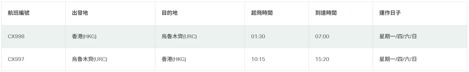 運輸及物流局局長陳美寶在慶祝酒會上表示:“ 國家於去年五月擴展了一簽多行“個人遊”計劃,新增八個城市,包括烏魯木齊。今日這個航線的開通,正好回應國家對我們的關顧和囑咐。 “烏魯木齊扮演着一個很重要的窗戶角色,除了客運,希望國泰可以帶領我們整個航空貨運業更上一層樓,透過這個新的窗口打造一條新的貨物通道,將世界各地不同航點帶來的空運產品,透過香港國際機場,再轉運到內地的不同的城市。 “由於它面對中亞,不單可以將香港連通內陸,更可以做到跨洲,甚至將我們的視野帶到“一帶一路”沿線的地方。” 國泰集團行政總裁林紹波表示:“國泰正致力擴展內地航線網絡,我們即將首航前往的烏魯木齊,擁有豐富多彩的文化體驗和壯麗的自然風光。我們十分期待歡迎顧客登上航班,前往探索這個新疆首府的獨特魅力。 “香港快運亦將於5月啟動常州及義烏航線,國泰集團屆時將營運客運航班往返內地共22個目的地。而在今年的夏季高峰期,每周往返內地航班總數更超過300對。我們將繼續致力加強香港、內地與全球各地的聯繫,為顧客提供更多目的地及航班選擇。” 國泰航空往來香港與烏魯木齊的直航航班以空中巴士A330-300航機營運,設有商務客艙和經濟客艙。航班時間如下(皆為當地時間):