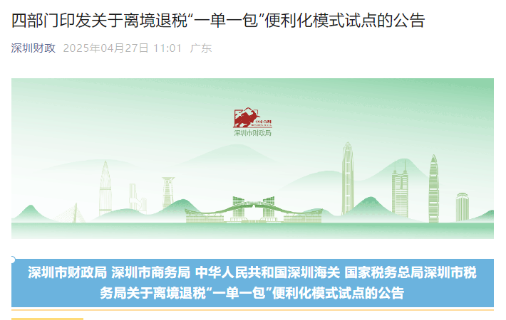 “深圳財政部”微信公眾號截圖 據新華社報道,離境退稅“一單一包”是指“一張退稅申請單對應一個商品密封包”。在購物環節,試點商店將使用標準密封袋對退稅商品進行打包,并與退稅申請單一一對應;在出境環節,海關只需查驗密封袋的完整性,即可快速放行,大幅縮短旅客等待時間。深圳市財政局、商務局、海關及稅務局27日聯合發佈的公告顯示,該模式為自願選擇,試點商店將免費提供密封包裝服務。