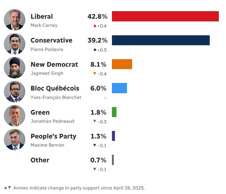 加拿大自由黨在最新民調中略微領先。加拿大廣播公司報道截圖 據英國廣播公司(BBC)28日報道,加拿大議會選舉已於當地時間4月28日上午開始。在特朗普的言論和政策激起加拿大人的憤怒後,應對特朗普的威脅已成為本次大選的核心議程。因此許多人認為,這次大選同時也是關於加拿大應該如何對待特朗普政府的投票。 本周,安大略省省長道格·福特(Doug Ford)對“政客新聞網”資深專欄作家喬納森·馬丁表示:“以前,人們說‘問題是經濟,笨蛋’;現在,‘問題是關稅,笨蛋’。” 加拿大橫跨六個時區,各地的投票時間有所不同。報道稱,東部的紐芬蘭與拉布拉多省的投票從紐芬蘭時間28日8時30分(北京時間19時)開始,西部的不列顛哥倫比亞省將從太平洋時間7時(北京時間22時)開始投票。預計初步選舉結果將在當地時間28日深夜或29日清晨公佈。 競爭主要在馬克·卡尼領導的自由黨和皮埃爾·普瓦列夫爾領導的保守黨之間展開。加拿大廣播公司(CBC)發佈的最新民意調查顯示,在投票開始前,自由黨以42.8%的支持率領先,保守黨以39.2%的支持率位居第二,排在第三名的新民主黨僅得到8.1%的支持。