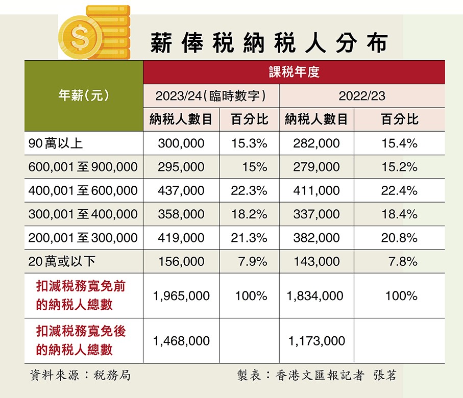 香港稅務局5月2日發出約266萬份個別人士報稅表,比2024年多22萬份。香港文匯報圖 薪俸稅收增11% 印花稅增30% 香港稅務局局長陳施維昨日(2日)在記者會上匯總2024/25年度整體稅收為約3,745億元,較對上一年度增加約325億元,增幅近一成。當中利得稅收入為1,777億元,按年增加72億元,增幅為4%;薪俸稅收入為889億元,按年度增加90億元,增幅為11%。印花稅增幅更明顯,該年度印花稅收為639億元,按年大增148億元,增幅達30%。 陳施維解釋,透過各類輸入人才計劃來港定居的人士,使香港的納稅人人數擴大,同時因為他們的入息水平提升,令薪俸稅稅收進一步增加。同時,2024/25年度應評稅利潤申報也增加,相信是因為有更多新公司成立,導致利得稅收入也上升。加上股票市場從今年2月底開始回復暢旺,物業市場的成交量亦增加,估算2025/26年度印花稅將進一步升至676億元。整體稅收也增至4,014億元。 美國濫施關稅,令全球經濟籠罩不明朗陰霾,被問到關稅戰會否對本港稅收產生影響時,陳施維強調會密切留意外圍因素,了解對香港經濟、企業及納稅人的影響,必要時會作出相應的評估。