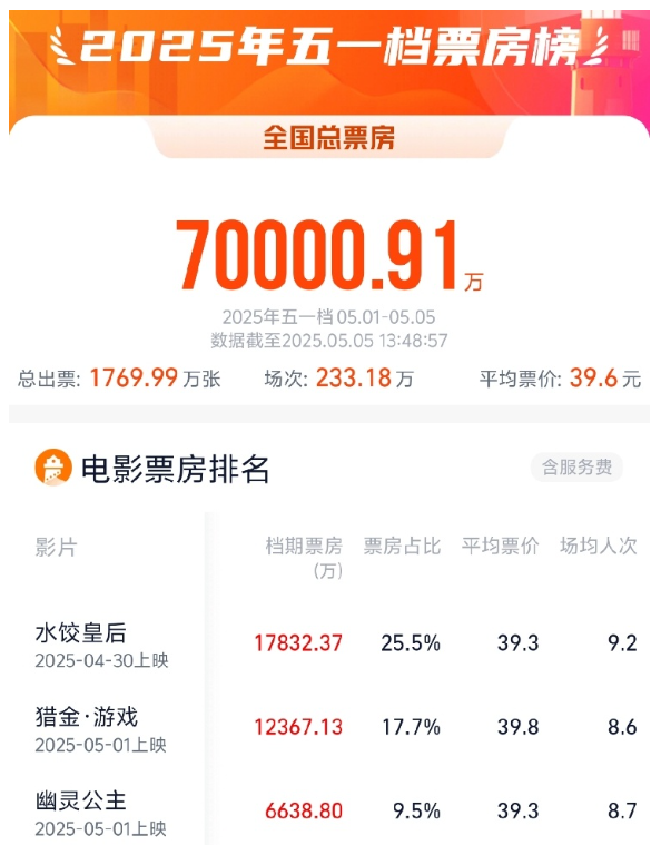 香港新聞網5月5日電 據網絡平台數據,截至5月5日13時48分,2025年五一檔(5月1日-5月5日)檔期內總票房突破7億,影片《水餃皇后》《獵金·游戲》《幽靈公主》暫列前三名。 今年“五一”小長假期間,影院再迎觀影熱潮,13部中外影片扎堆上映。目前,2025年五一檔(5月1日—5月5日)檔期內總票房(含預售)已突破5億。其中,《水餃皇后》繼續領跑。