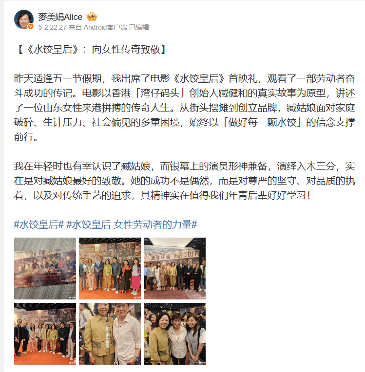 電影票房排名。(數據截至5月5日 13:48) 五一檔最受關注的電影莫過於《水餃皇后》,影片主演馬麗表示:“這是一部向媽媽致敬的電影,希望大家走進電影院,感受愛,分享愛。”惠英紅、朱亞文等實力派演員的加盟,更是為影片增色不少。 《水餃皇后》,前名《陽光碼頭》,是一部2025年的中國大陸劇情片,改編自香港水餃品牌“灣仔碼頭”創始人臧健和的生平經歷,由劉偉強執導,馬麗領銜主演、惠英紅、朱亞文友情特別出演。 香港特區政府民政及青年事務局局長麥美娟在其微博上發文表示:”電影以香港‘灣仔碼頭’創始人臧健和的真實故事為原型,講述了一位山東女性來港拼搏的傳奇人生。從街頭擺攤到創立品牌,臧姑娘面對家庭破碎、生計壓力、社會偏見的多重困境,始終以‘做好每一顆水餃’的信念支撐前行。我在年輕時也有幸認識了臧姑娘,而銀幕上的演員形神兼備,演繹入木三分,實在是對臧姑娘最好的致敬。她的成功不是偶然,而是對尊嚴的堅守、對品質的執著,以及對傳統手藝的追求,其精神實在值得我們年青後輩好好學習!”