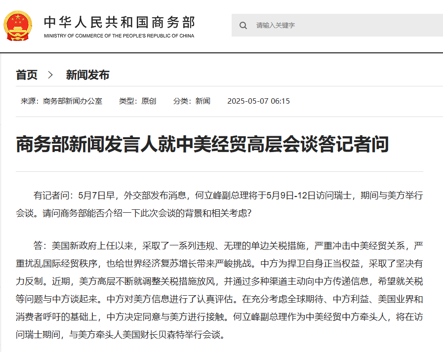 中國商務部網站消息,5月7日,商務部新聞發言人就中美經貿高層會談答記者問。有記者提及,5月7日早,外交部發布消息,何立峰副總理將於5月9日至12日訪問瑞士,期間與美方舉行會談。發言人回應表示,美國新政府上任以來,採取了一系列違規、無理的單邊關稅措施,嚴重衝擊中美經貿關係,嚴重擾亂國際經貿秩序,也給世界經濟復甦增長帶來嚴峻挑戰。中方為捍衛自身正當權益,採取了堅決有力反制。