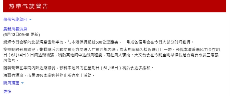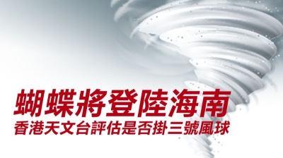 香港新聞網6月15日電 據香港天文台最新發佈,三號強風信號會在今日下午初時維持。 天文台指,今早熱帶低氣壓蝴蝶繼續減弱並移入廣東內陸,但其外圍雨帶正為廣東沿岸帶來狂風驟雨。現時本港多處仍吹強風,高地間中吹烈風,三號強風信號會在今日下午初時維持。
