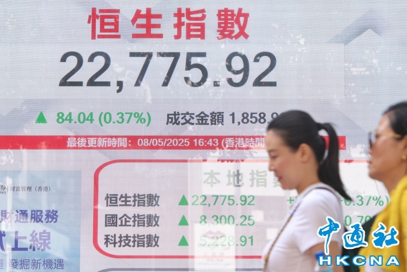 香港中通社5月8日電(記者 張明臻)消息指美國將與英國達成貿易協議,市場憧憬全球貿易戰緩和。恆指8日收報22775點,升84點或0.4%;大市全日成交1858億港元,北水淨沽23.8億。