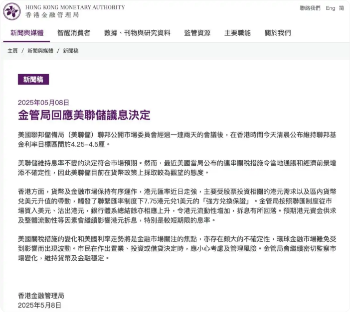 圖源:香港金融管理局。 金管局發言人指出,近期港元強勢主要源於股票投資相關的港元需求激增。數據顯示,香港交易所2025年一季度新股融資額位列全球前五,完成自2021年4月以來規模最大的兩宗再融資發行。當前第二季度仍有120宗上市申請正在處理中,大型IPO項目對港元流動性的吸納效應顯著。 同時,據匯豐環球研究在4月23日的報告中預警,港股上市公司前置派息活動與IPO需求叠加,可能令港元短期內面臨額外昇值壓力。據測算,傳統派息旺季(6月至8月)的港元需求通常推高匯率,而今年大型金融機構已將派息高峰提前至5月至6月。市場人士分析,2025年上市企業派息規模或超3000億港元,直接刺激港元買盤。 而南下資金亦成為推手之一。公開資料顯示,2025年一季度通過港股通淨流入香港市場的內地資金達1278億港元,較去年同期增長23%,進一步加劇港元供需失衡。 聯繫匯率制度穩守防線 香港自1983年起實施聯繫匯率制度,將港元兌美元匯率錨定在7.75至7.85區間。根據貨幣發行局機制,港元貨幣基礎需以1:7.8的固定匯率由美元資產全額支持。當市場匯率觸及7.75強方兌換保證時,金管局需向銀行體系賣出港元、買入美元,擴大貨幣基礎以壓低港元利率;反之在7.85弱方兌換保證則反向操作收縮流動性。 這一機制在過去40年曆經多次金融危機考驗,始終維持匯率穩定。根據金管局昨日公佈的數據,香港4月底的外匯儲備資產為4,079億美元,相當於香港流通貨幣5倍多。作為全球少數執行嚴格貨幣局制度的地區之一,維持匯率穩定是香港高度開放型經濟體的核心政策目標,制度設計有效阻隔外部衝擊對本地金融體系的擾動。 儘管近期干預規模創新高,但金管局強調銀行體系總結餘充足,流動性管理工具完備。目前香港同業拆息(HIBOR)與美元倫敦同業拆息(LIBOR)利差已收窄至15個基點以內,利率傳導機制持續生效。香港金管局發言人表示,近期港元偏強,主要是由於股票投資相關的港元需求有所增加,支持港元匯價。此外,多隻區內貨幣近日兌美元昇值,亦帶動港匯走強。香港金管局將繼續密切留意市場動態,確保港元市場有序運作。 聯繫匯率制度的核心競爭力在於其透明性與紀律性。金管局堅守兌換承諾的紀錄,為投資者注入強心劑。2025年一季度香港離岸人民幣存款規模達1.2萬億同比增長14%,跨境貿易結算額突破2.3萬億元,進一步印證其國際金融樞紐地位的穩固性。 (完) 【編輯:錢林霞】