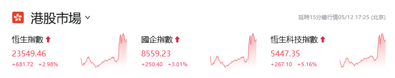 港股迅速拉升。(圖源:富途) 美股三大期指亦快速拉高,納斯達克100指數期貨大漲超3%,美元指數亦直線拉升,現漲超1%;歐洲股市開盤後,多國股市全線大漲。 與此同時,外資機構對中國資產的後市展望愈發樂觀。在中美日內瓦經貿會談聯合聲明發佈前夕,花旗銀行5月12日發表報告表示,假設中美就關稅問題談判取得進展,上調恒生指數今年底目標價2%至25000點,并予明年上半年目標價26000點。 商務部、外交部最新發聲 今日下午,商務部發佈《商務部新聞發言人就中美日內瓦經貿會談聯合聲明發表談話》(下稱《談話》),《談話》稱,雙方一致同意建立中美經貿磋商機制,就經貿領域各自關切保持密切溝通,開展進一步磋商。中方代表是國務院副總理何立峰,美方代表是財政部長貝森特和貿易代表格里爾。雙方將定期或不定期輪流在中國、美國開展磋商,或在商定的第三國開展磋商。根據需要,雙方可就相關經貿議題開展工作層面磋商。 《談話》提到,本次中美經貿高層會談取得實質性進展,大幅降低雙邊關稅水平,美方取消了共計91%的加征關稅,中方相應取消了91%的反制關稅;美方暫停實施24%的“對等關稅”,中方也相應暫停實施24%的反制關稅。這一舉措符合兩國生產者和消費者的期待,也符合兩國利益和世界共同利益。希望美方以這次會談為基礎,與中方繼續相向而行,徹底糾正單邊加稅的錯誤做法,不斷加強互利合作,維護中美經貿關係健康、穩定、可持續發展,共同為世界經濟注入更多確定性和穩定性。 全球股市沸騰 黃金直線跳水 消息發佈後,港股主要指數全線拉升,恒生科技指數一度大漲超6%,截至15:30,恒生指數漲3.29%,恒生科技指數大漲5.93%,國企指數漲3.42%。富時中國A50指數期貨直線拉升,截至15:30,漲1.94%。離岸人民幣兌美元一度大漲超400點,現報7.2075。 港股蘋果概念股拉升,高偉電子大漲超20%,瑞聲科技大漲超17%,比亞迪電子、舜宇光學科技大漲超16%。港股汽車股大漲,截至15:30,小鵬汽車漲超11%,理想汽車、蔚來汽車漲超8%,比亞迪股份漲超7%。 美股三大期指亦快速拉高,納斯達克100指數期貨大漲超3%,道指期貨、標普500指數期貨均漲超3%,羅素2000期貨大漲4.3%。美國10年期國債收益率攀升至一個月高點,美元指數亦直線拉升,現漲超1%。 歐洲股市開盤後,多國股市全線大漲,截至15:30,歐洲斯托克50指數漲1.86%,德國DAX指數漲1.55%,法國CAC 40指數漲1.2%,英國富時100指數漲0.6%。 現貨黃金直線跳水,日內跌幅一度擴大至3%,現報3223.79美元/盎司。 國際投資機構看好後市中國資產 摩根士丹利摩根士丹利上周五(5月9日)在一份報告中指出,在看到中美可能達成貿易協議的跡象後,美國對衝基金紛紛買入了在美股交易和在A股市場交易的股票,“重新接觸”了中國。消息指,美國的對衝基金——上周增加了對中國股票的看漲押注,寄望於美中貿易談判取得進展。 同時,在中美日內瓦經貿會談聯合聲明發佈前夕,花旗銀行5月12日也發表報告表示,假設中美就關稅問題談判取得進展,上調恒生指數今年底目標價2%至25000點,并予明年上半年目標價26000點。 另外,今日A股市場全天高開高走,滬指收漲0.82%,深成指收漲1.72%,創業板指收漲2.63%。滬深兩市全天成交額1.31萬億元,較上個交易日放量1164億元。由於聯合聲明發佈時A股已收盤,明天走勢會如何值得期待。有業內人士解讀表示,今天下午3點後,三十年期國債期貨出現放量跳水,跌幅超過1.3%,并且一次性跌破了20日線和30日線支撐位,打破了前面一段時間的上行趨勢。國債期貨價格走弱,是場外資金回流A股意願加強的重要信號!只要有增量資金進場,A股市場就有可能突破去年10月到今年3月形成的箱體平台。一旦國債期貨價格持續走弱,即便明天A股是高開震蕩的走勢,短期趨勢也不會弱!(完) 【編輯:錢林霞】